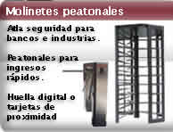 Los molinetes peatonales son la opción más adecuada para controlar accesos de manera rápida y eficaz. Fabricados en acero inoxidable son capaces de funcionar sin inconvenientes bajo un uso constante. El molinete puede permitir el acceso mediante lectoras de tarjetas de proximidad, huella digital (o ambas tecnologías juntas) o activado por un agente de seguridad desde la guardia. Cuenta con una ranura para que los visitantes (a los cuales se les asigna una tarjeta de proximidad cuando ingresan) al egresar depositen las tarjetas en el molinete; este las guarda en su buzón integrado y habilita el egreso de la persona, evitando la pérdida de la tarjeta por olvido de devolución.